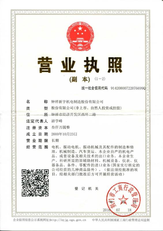 鐘祥新宇機電制造股份有限公司前身是鐘祥電機廠,創(chuàng)建于1968年,于2014年9月24日由“鐘祥新宇機電制造有限公司”變更名為“鐘祥新宇機電制造股份有限公司”。主要生產(chǎn)各類振動電機、振動機械、輸送機械。是中國電器工業(yè)協(xié)會中小型電機分會理事單位、中國重型機械工業(yè)協(xié)會洗選設(shè)備專業(yè)委員會理事單位,是中國具備真實生產(chǎn)實力的振動電機生產(chǎn)廠家。 ■ 企業(yè)產(chǎn)品 振動電機:VA、VB系列振動電機、VBH系列頻繁起動振動電機、VBL立式振動電機、VBB系列隔爆振動電機、VLB系列戶外隔爆振動電機、VBCB側(cè)板式振動電機、VLBL鋁殼長桿振動電機。 振動機械:側(cè)板式激振器、直線振動篩、圓振篩、振動給料機、振動料斗、振動輸送機、振動放礦機、帶式輸送機。 ■ 企業(yè)優(yōu)勢 科研開發(fā)力量雄厚,公司技術(shù)中心認(rèn)定為“湖北省企業(yè)技術(shù)中心”,現(xiàn)有教授級高級工程師2人,享受國家政府津貼專家2人,是國家部頒(行業(yè))標(biāo)準(zhǔn)《振動源三相異步振動電機技術(shù)條件》的主要制訂單位。企業(yè)內(nèi)部局域網(wǎng)、公司網(wǎng)站、CAD設(shè)計系統(tǒng)、互聯(lián)網(wǎng)已構(gòu)筑起企業(yè)計算機信息管理系統(tǒng);企業(yè)質(zhì)量管理體系獲得ISO9001:2000質(zhì)量管理體系認(rèn)證證書;產(chǎn)品獲CQC認(rèn)證和CCC認(rèn)證;享有“外貿(mào)進出口自營權(quán)”。是國內(nèi)很早生產(chǎn)振動電機的廠家之一,生產(chǎn)的“宇興”牌振動電機是國內(nèi)振動電機行業(yè)和廣大客戶公認(rèn)的品牌產(chǎn)品。 ■ 企業(yè)榮譽 “湖北省著名企業(yè)”、“高新技術(shù)企業(yè)認(rèn)定證書”、“實用新型專利證書”、“湖北名牌產(chǎn)品證書”、“湖北省企業(yè)技術(shù)中心”、“國家重點新產(chǎn)品證書”、“優(yōu)秀民營科技企業(yè)”、“國家重點新產(chǎn)品證書”。